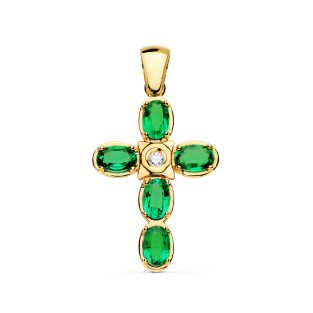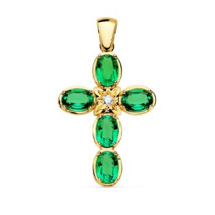 18K CRUZ ORO AMARILLO BRILLANTE 0.065 QTS. 30X21 MM ESMERALDAS 3.75 QTS