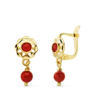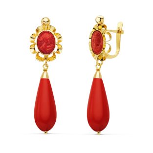18K PENDIENTES ORO AMARILLO PERA CORAL ROJO NATURAL 25X6 MM ORIGEN CERDEÑA