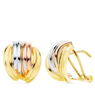 18K PENDIENTES ORO TRICOLOR BANDAS LISAS 13X12 MM CIERRE OMEGA