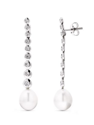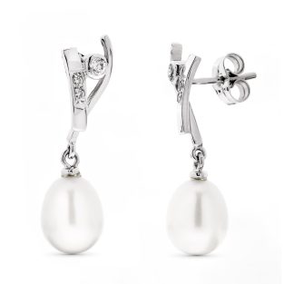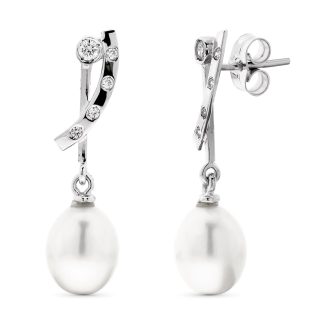 18K PENDIENTES ORO BLANCO LARGOS PERLA 9 9.5 MM Y CIRCONITAS