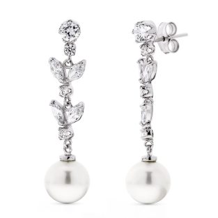 18K PENDIENTES ORO BLANCO LARGOS PERLA 14 MM Y CIRCONITAS