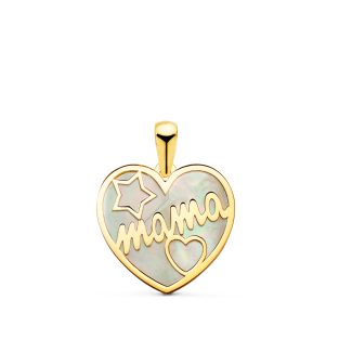 18K COLGANTE DE CORAZON CON NACAR MAMA Y DIBUJO DE ESTRELLA Y CORAZON 16X14MM