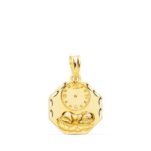 18K MEDALLA OCTOGONAL NIÑO DE LA HORA CON RELOJ TALLADA 15X15 MM