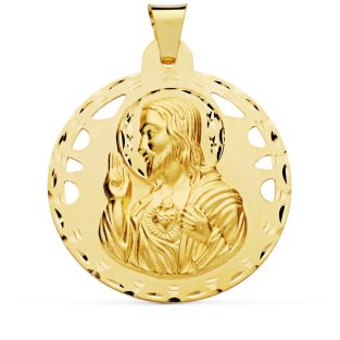 18K MEDALLA CRISTO SAGRADO CORAZON DE JESUS CALADO CERCO HELICE TALLADO 30 MM