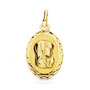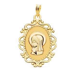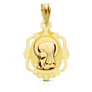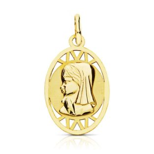 9K MEDALLA ORO AMARILLO VIRGEN NIÑA CALADA MATE Y BRILLO 19X11 MM