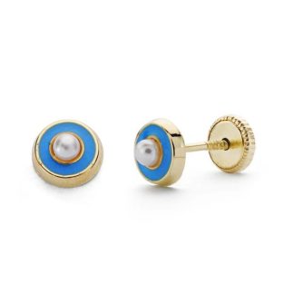 18K PENDIENTES ORO AMARILLO PERLA Y ESMALTE AZUL 5 MM