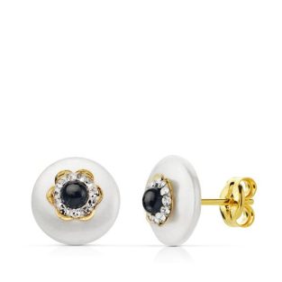 18K PENDIENTES ORO AMARILLO NACAR 9 MM PIEDRA AZUL 3 MM PRESION