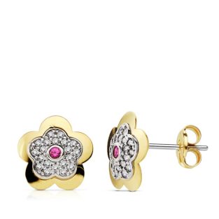 18K PENDIENTES ORO AMARILLO FLOR COLOR RUBI CIRCONITAS