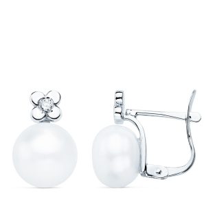 18K PENDIENTES ORO BLANCO DIAMANTES 0.06 QTS G-VS2. PERLA 8.5 MM 13X8.5 MM