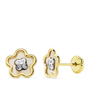 18K PENDIENTES ORO BICOLOR FLOR CON CIRCONITAS 13X7 MM CIERRE CATALAN