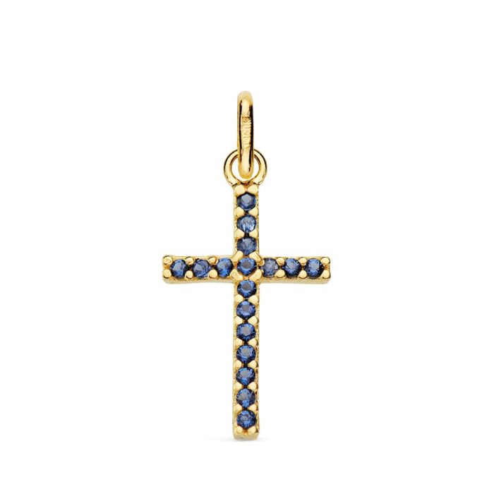18K CRUZ ORO AMARILLO PIEDRAS AZULES 16X10 MM