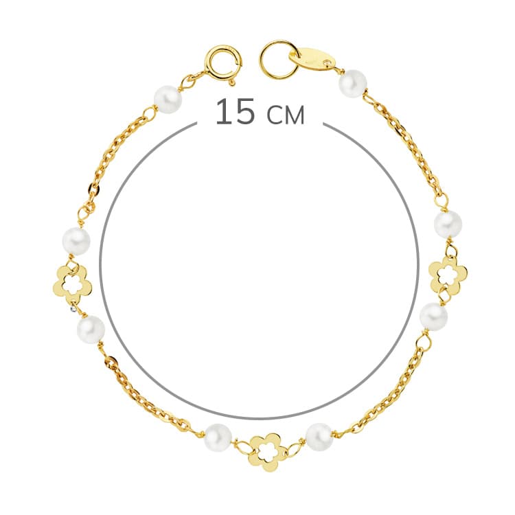 18K PULSERA PERLA 3.5 MM Y FLORES 15 CM