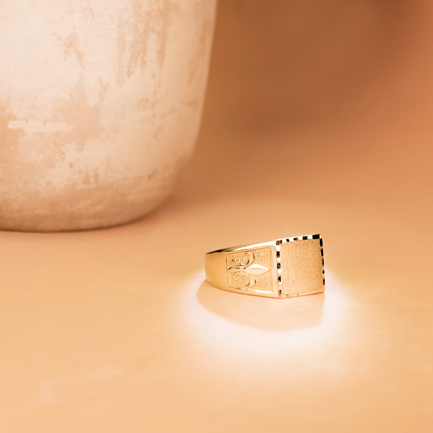 18K SELLO ORO AMARILLO CABALLERO MACIZO FLOR DE LIS TALLADO ZONA GRABADO 11,5 X 11MM
