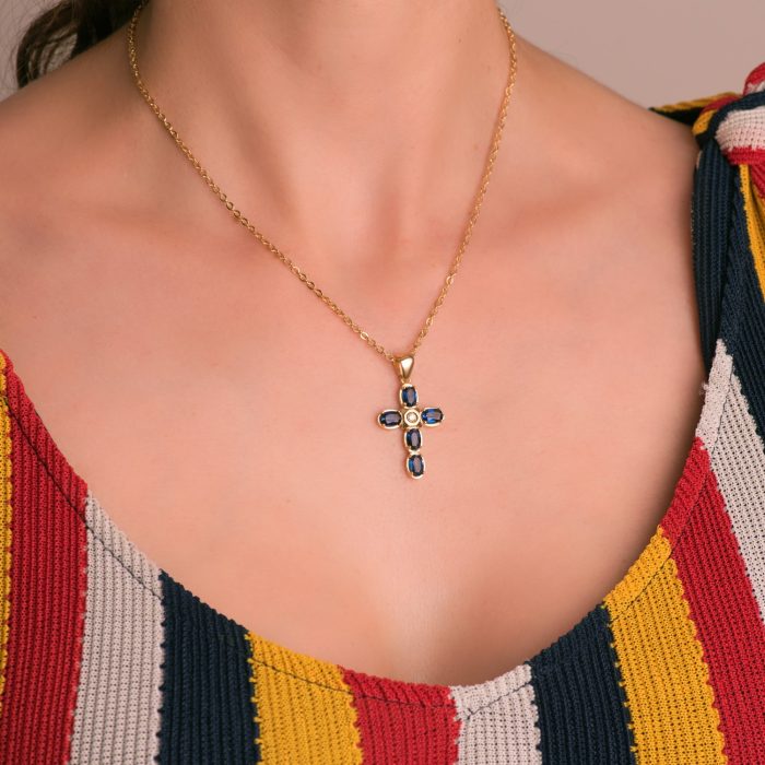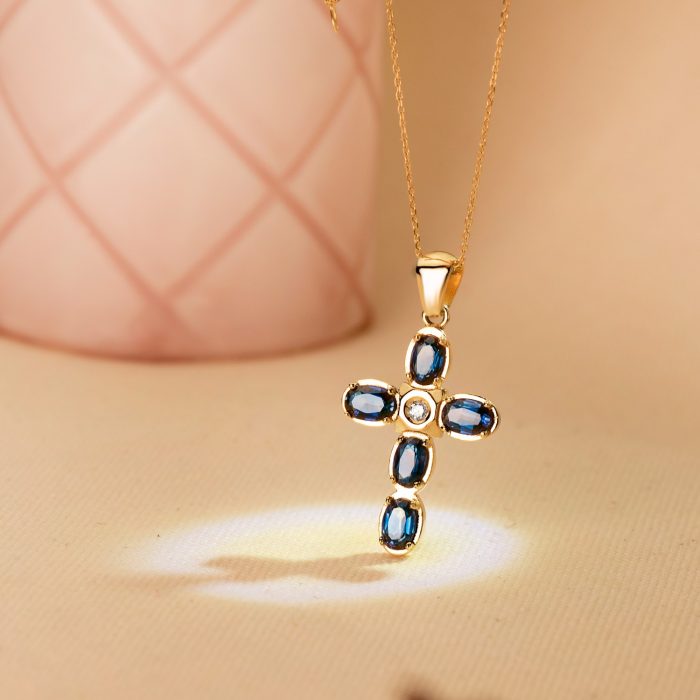 18K CRUZ ORO AMARILLO DIAMANTE 0.045 QTS. ZAFIROS DIFUSION 6X4 MM 3.10 QTS. 30X19 MM