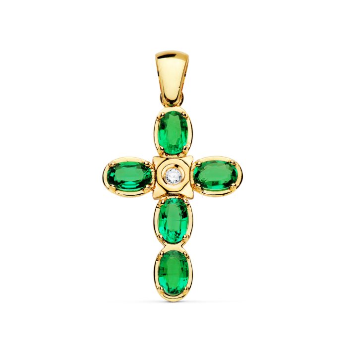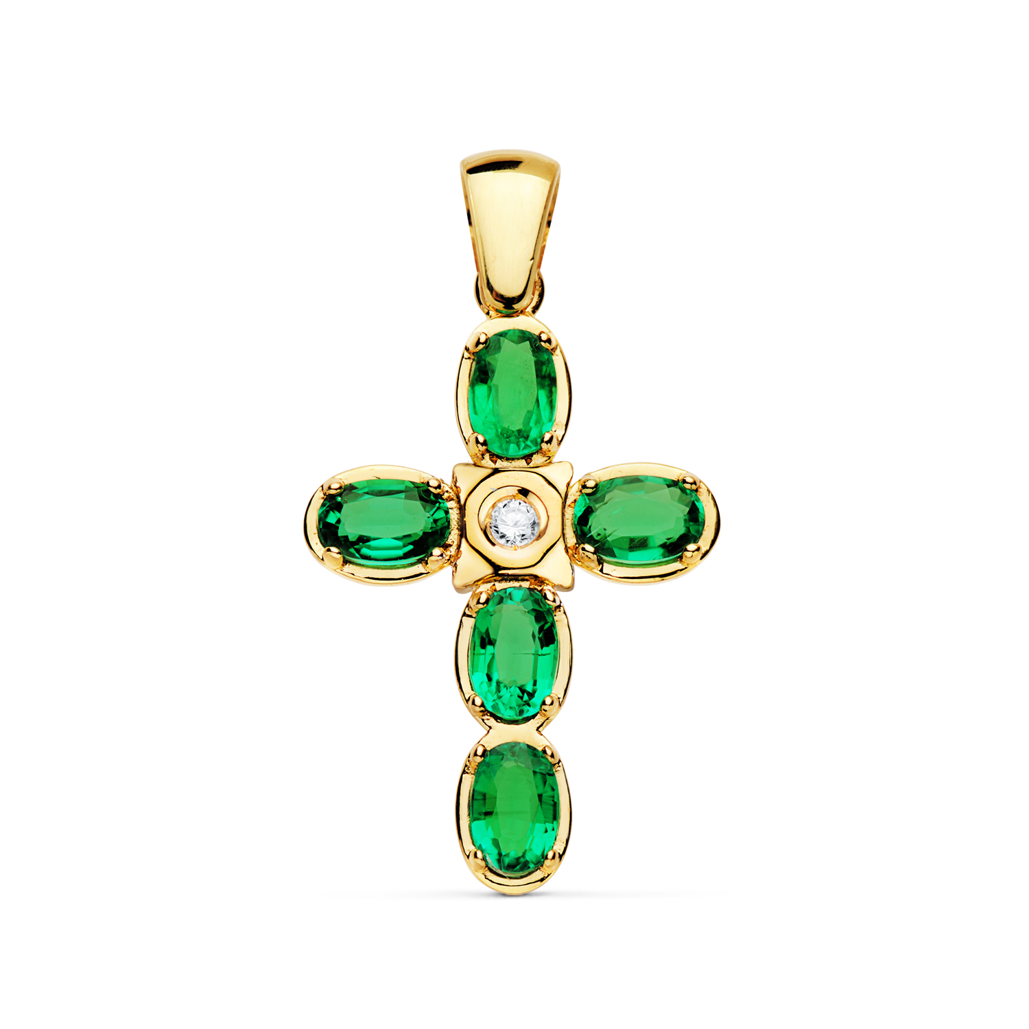 18K CRUZ ORO AMARILLO DIAMANTE 1.95 QTS. ESMERALDAS 0.49 QTS MEDIDAS 28X19 MM