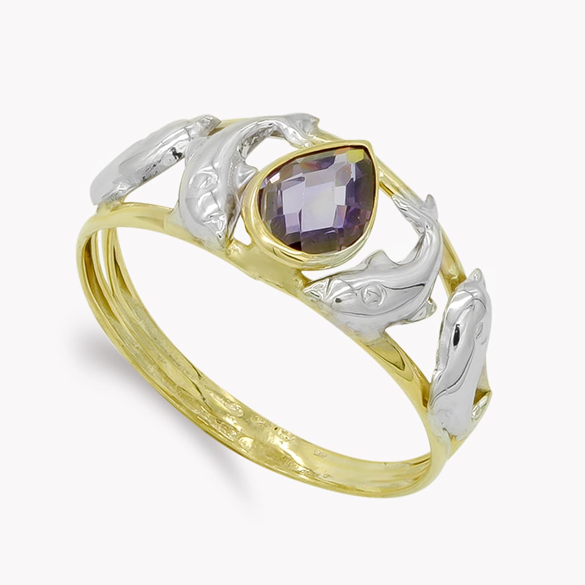9K SORTIJA BICOLOR PIEDRA AMATISTA Y DELFINES
