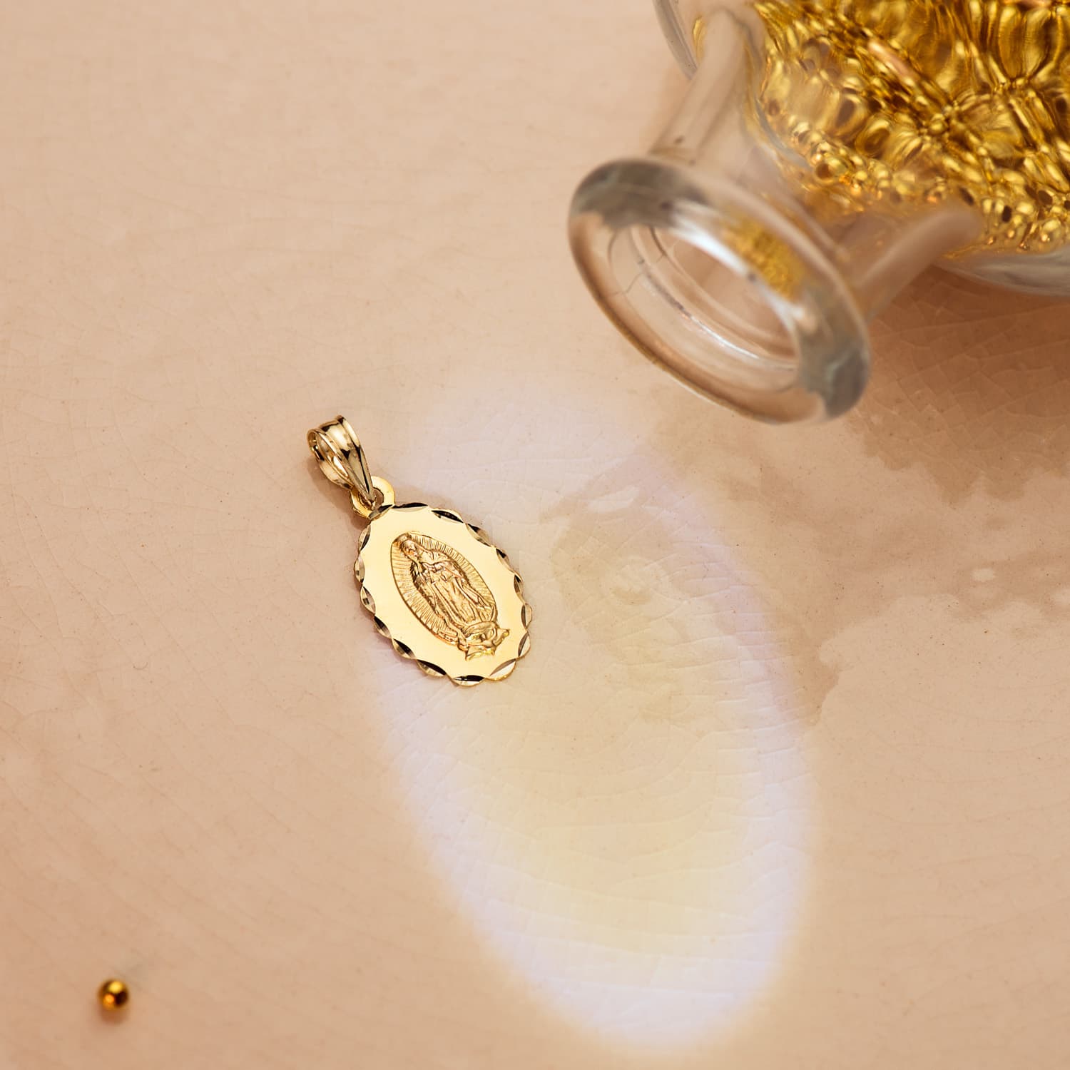 9K MEDALLA VIRGEN GUADALUPE OVAL BORDE ARCOS TALLADOS 16X11 MM
