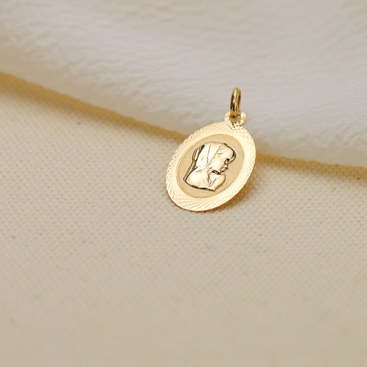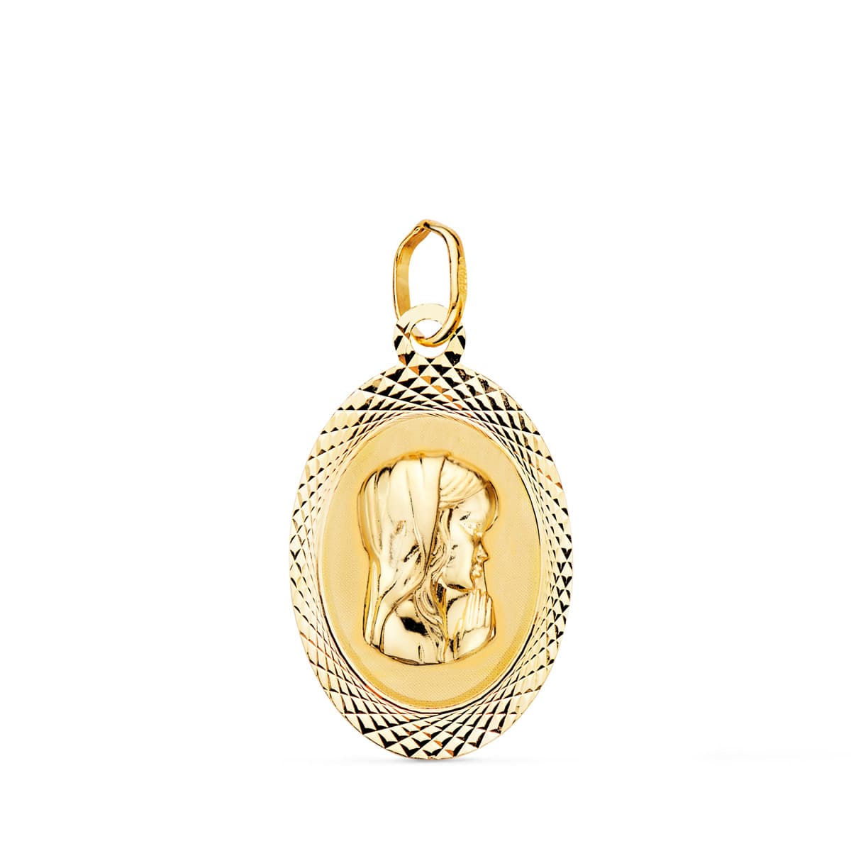 9K MEDALLA VIRGEN NIÑA OVAL TALLADA BRILLO Y MATE 18X12 MM
