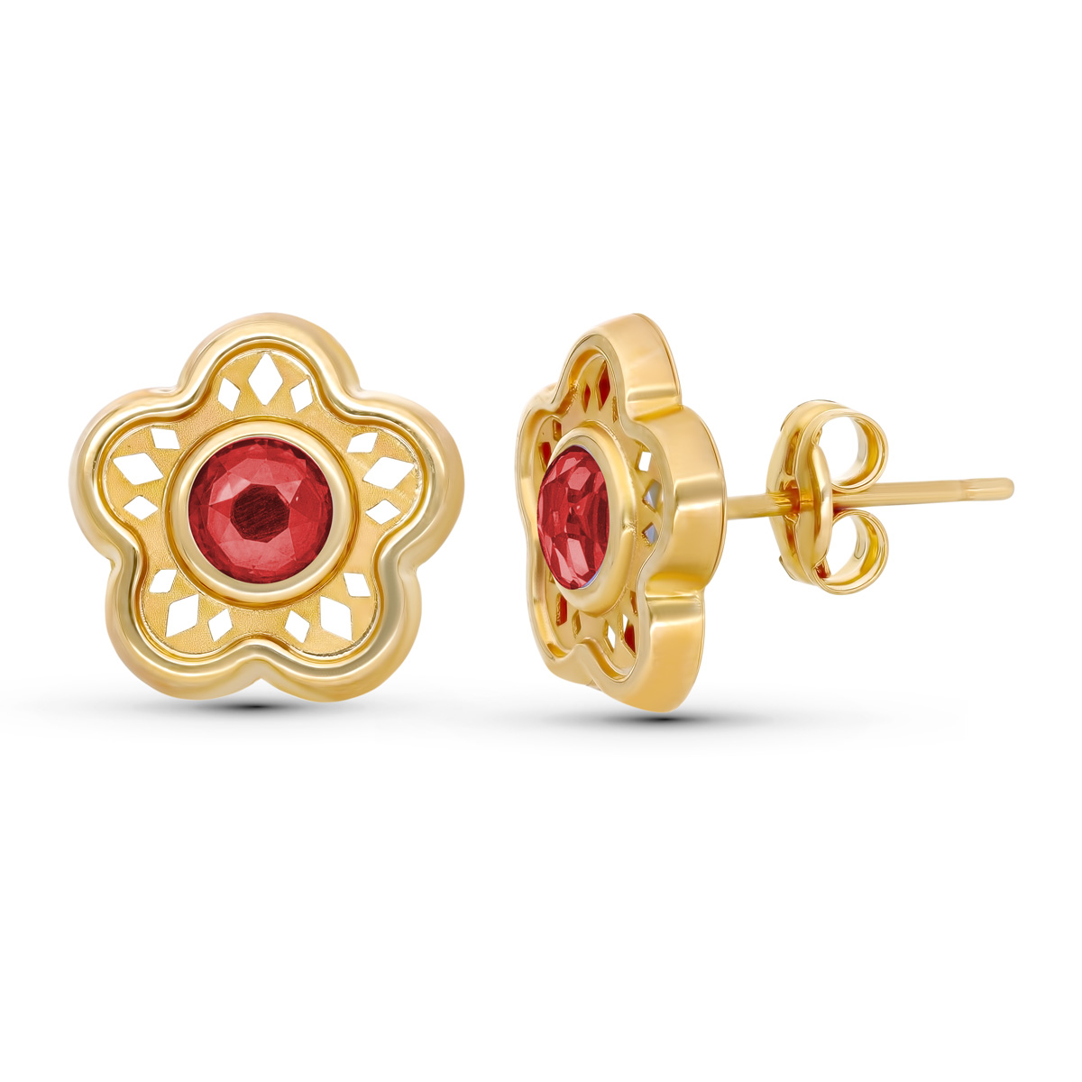 9K PENDIENTES ORO AMARIILLO FLOR 11MM PIEDRA ROJA