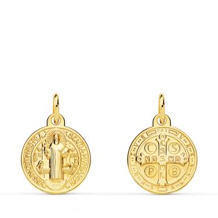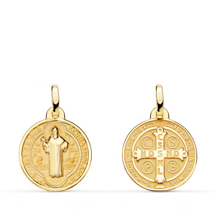 18K MEDALLA ESCAPULARIO SAN BENITO MONJE BRILLO Y FONDO MATIZADO 16 MM