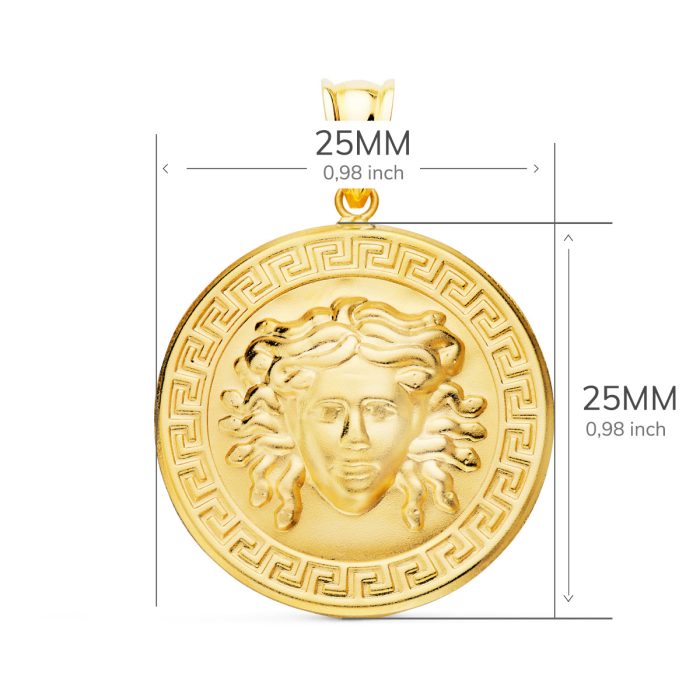 18K MEDALLA ORO AMARILLO MEDUSA CON BORDE DE GRECA MATIZADA 25 MM