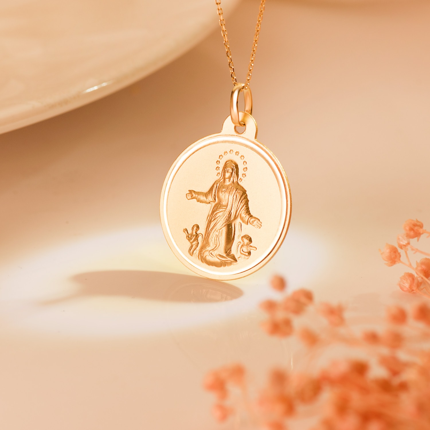 Celebra la espiritualidad con esta Medalla de Oro de Ley de 18 Kilates, donde la devoción se encuentra con el lujo. Cada detalle de 18K MEDALLA ORO AMARILLO VIRGEN DE LA ASUNCION BISEL 22 MM es una expresión de fe radiante. Fusionando la pureza del oro con la artesanía excepcional, esta medalla es más que una joya, es una conexión divina que lleva contigo la elegancia eterna. Además esta Medalla está fabricada por el prestigioso fabricante de joyería Pérez Mora de Córdoba, cuna de la joyería de Oro en España.