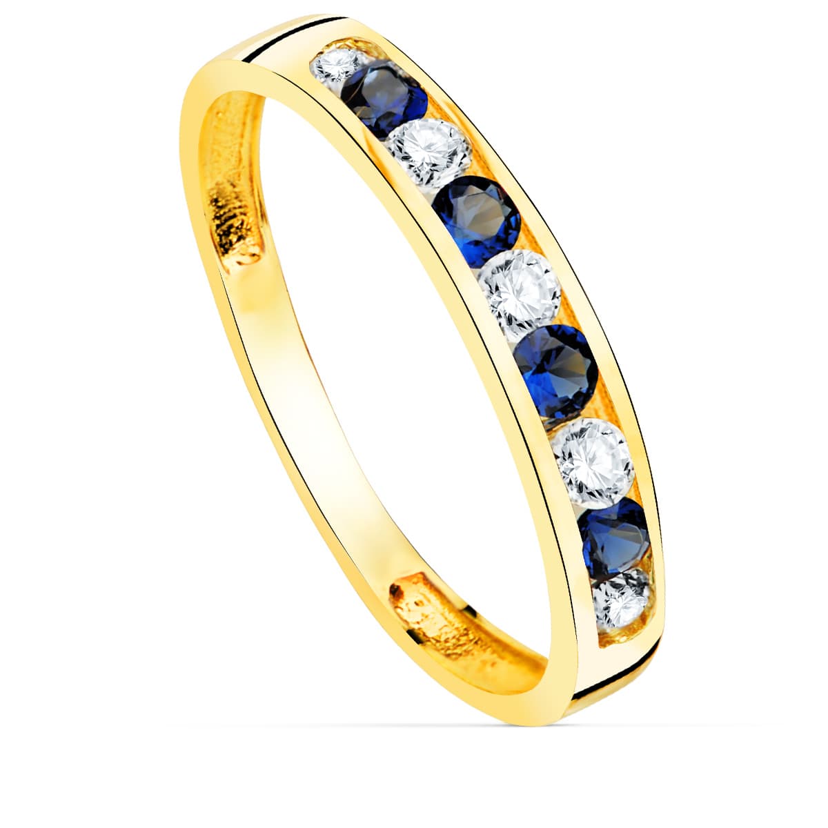 18K SORTIJA ORO AMARILLO 9 CIRCONITAS BLANCAS Y AZULES. ANCHO CUERPO 3.5 MM
