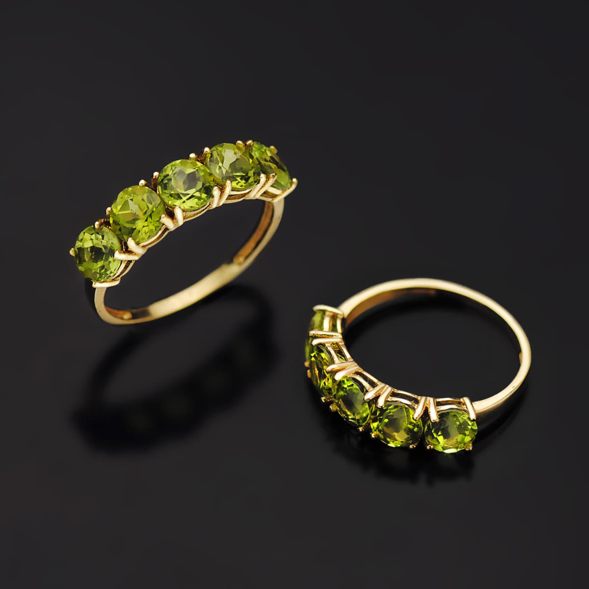 18K SORTIJA ORO AMARILLO CON 5 OLIVINAS NATURALES 2.87 QTS. ANCHO PIEDRAS 5 MM