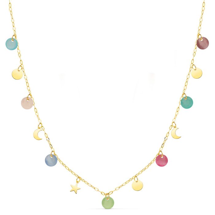 18K GARGANTILLA AMARILLO CHAPAS FORMAS 5 MM Y PIEDRAS 5 MM CADENA FORZADA 45 CM