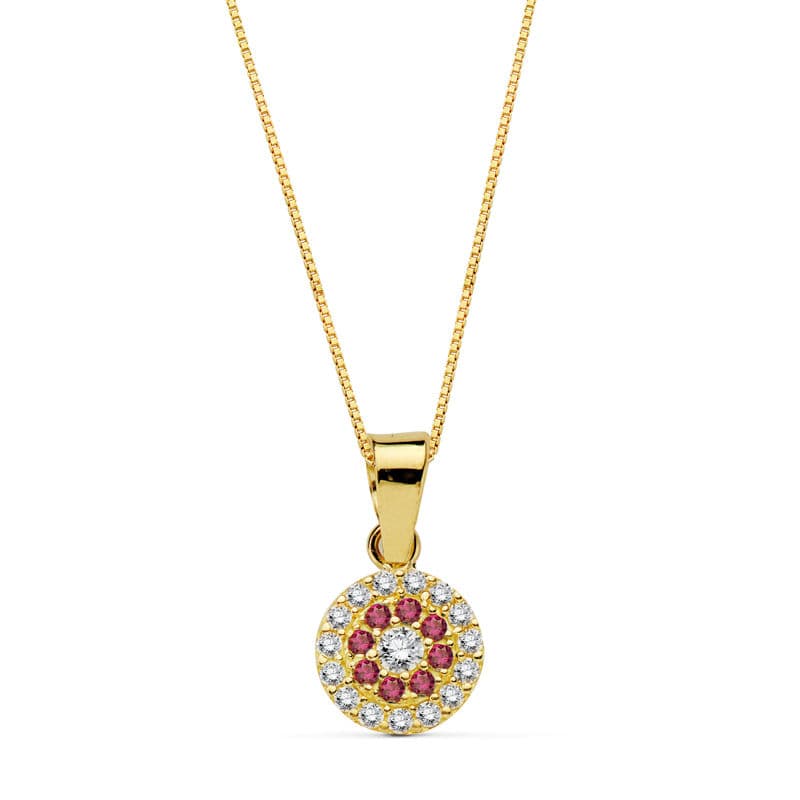 18K GARGANTILA COLLAR ORO AMARILLO REDONDO PIEDRA ROJA 7 MM CADENA 45 CM
