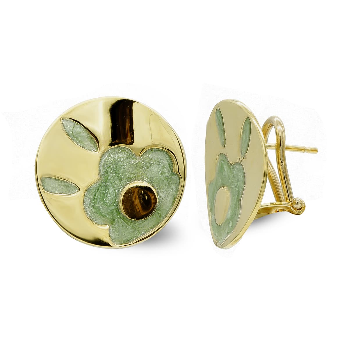 18K PENDIENTES ORO AMARILLO REDONDOS ESMALTE FLOR 19X19 MM