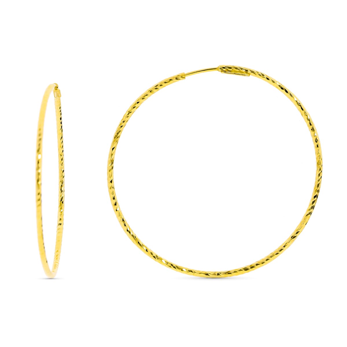 Deslumbra con estos Pendientes Aros de Oro de Ley de 18 Kilates, un testimonio de elegancia eterna. Cada pieza 18K AROS ORO AMARILLO DIAMANTADOS. 40X1.50 MM es una obra maestra reluciente que fusiona la pureza del oro con un diseño atemporal. Refleja tu estilo con la distinción del oro puro, una joya que eleva cualquier ocasión con su resplandor incomparable. Además estos Aros están fabricados por el prestigioso fabricante de joyería Pérez Mora de Córdoba, cuna de la joyería de Oro en España.