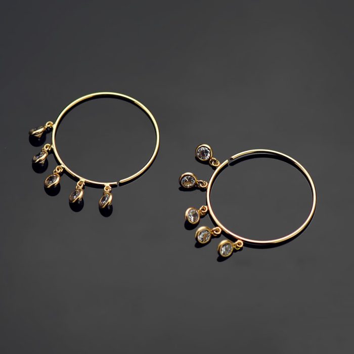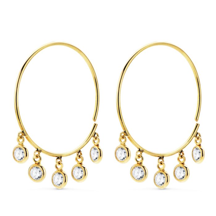 18K AROS ORO AMARILLO HILO DE 20 MM CON 5 COLGANTES CIRCONITAS BLANCAS