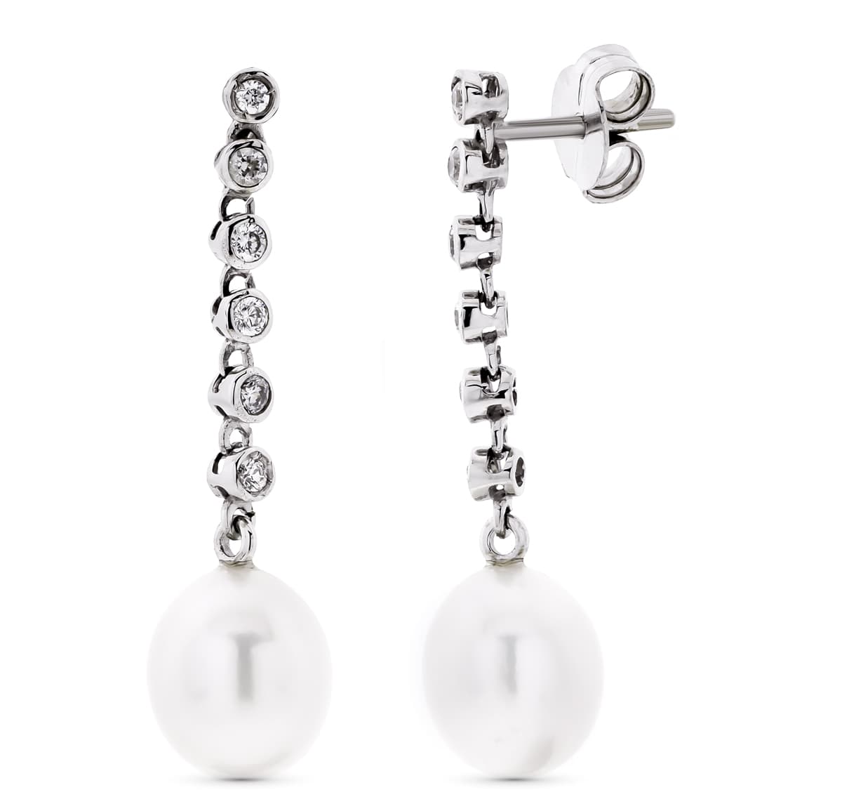 18K PENDIENTES ORO BLANCO LARGOS CON CIRCONITAS Y PERLA CIERRE PRESION