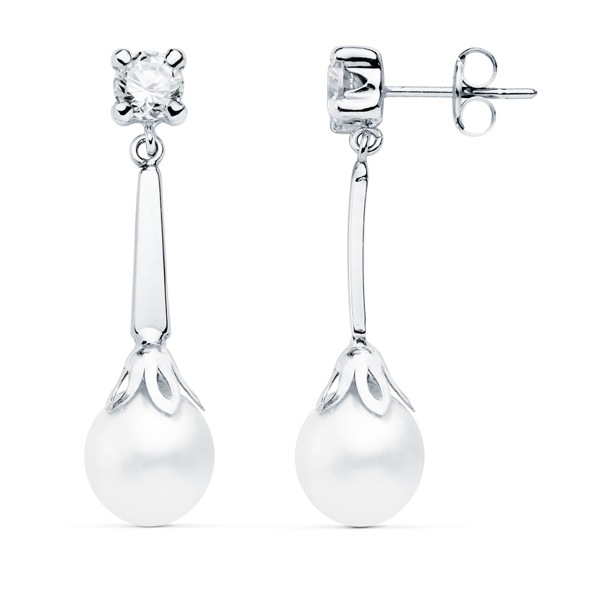 18K PENDIENTES ORO BLANCO PERLA Y CIRCONITAS 27X7 MM