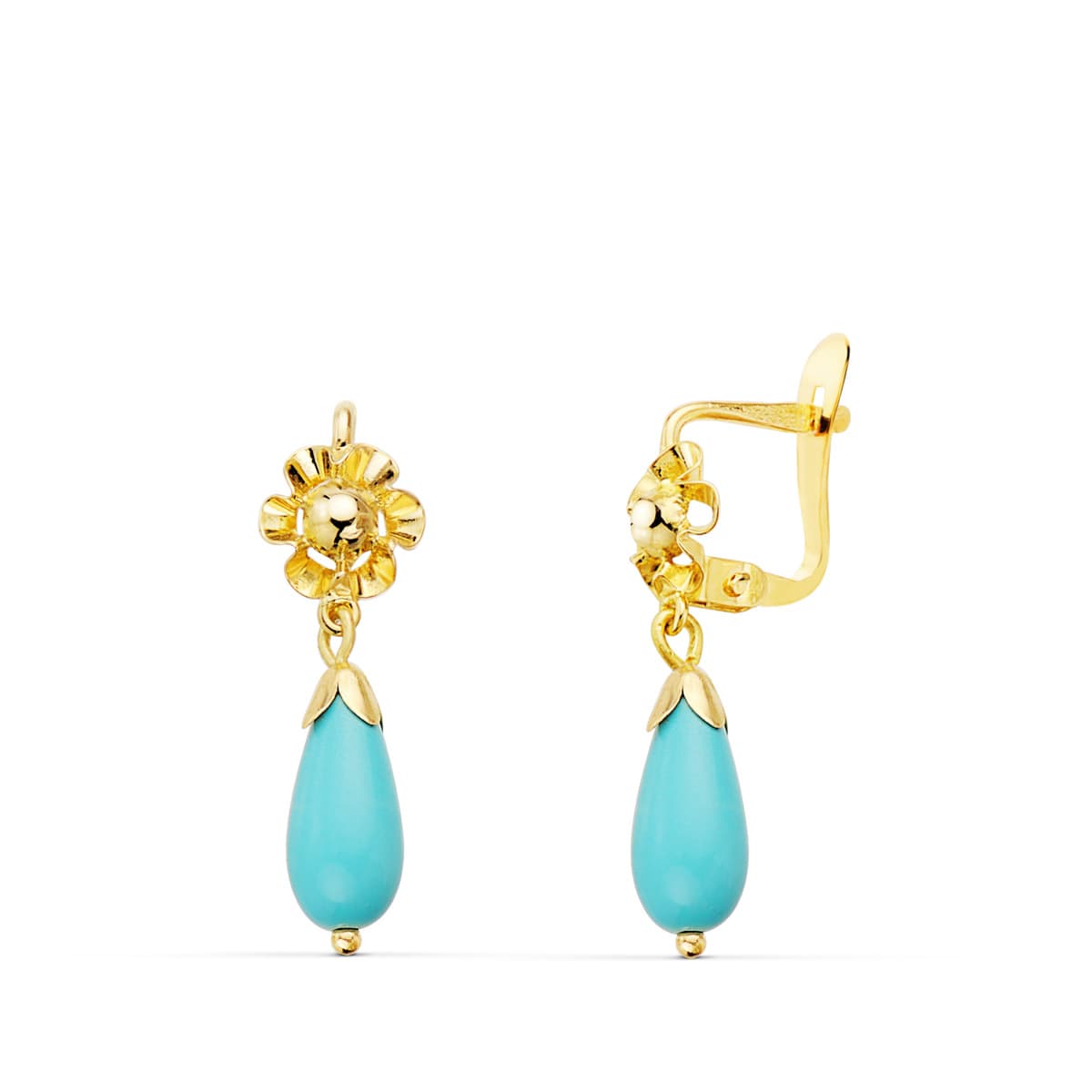 18K PENDIENTES ORO AMARILLO ARQUILLO TURQUESA LAGRIMA 21X7 MM CIERRE CATALAN