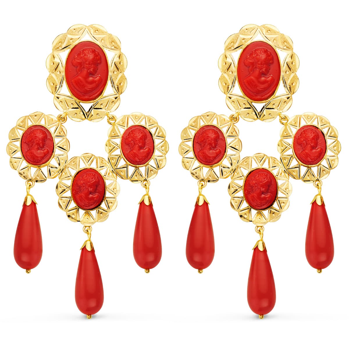 Deslumbra con estos Pendientes de Oro de Ley de 18 Kilates, un testimonio de elegancia eterna. Cada pieza 18K PENDIENTES ORO AMARILLO MANTILLA CAMAFEO Y CORAL 70X38 MM CATALAN es una obra maestra reluciente que fusiona la pureza del oro con un diseño atemporal. Refleja tu estilo con la distinción del oro puro, una joya que eleva cualquier ocasión con su resplandor incomparable. Además estos Pendientes están fabricados por el prestigioso fabricante de joyería Pérez Mora de Córdoba, cuna de la joyería de Oro en España.