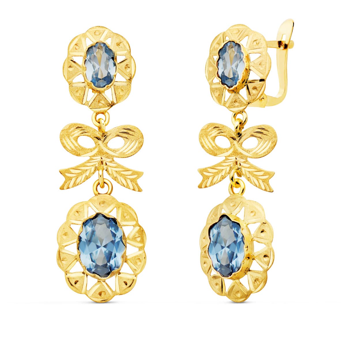 18K PENDIENTES ORO AMARILLO CUBANAS CON LAZO CIRCONITAS AGUAMARINA 55X20 MM