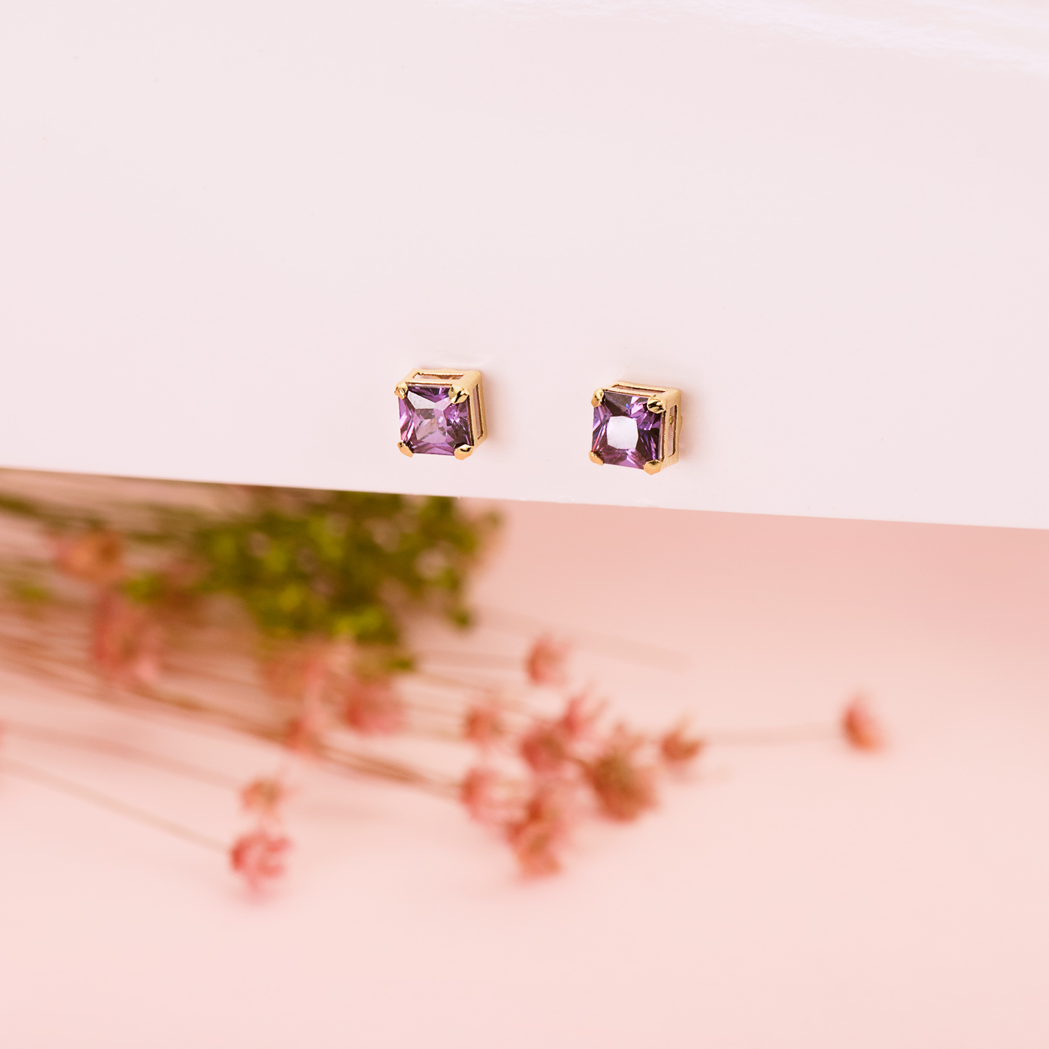 18K PENDIENTES ORO AMARILLO CUADRADOS PIEDRA COLOR AMATISTA 5,5 X 5,5 MM. CIERRE PRESION