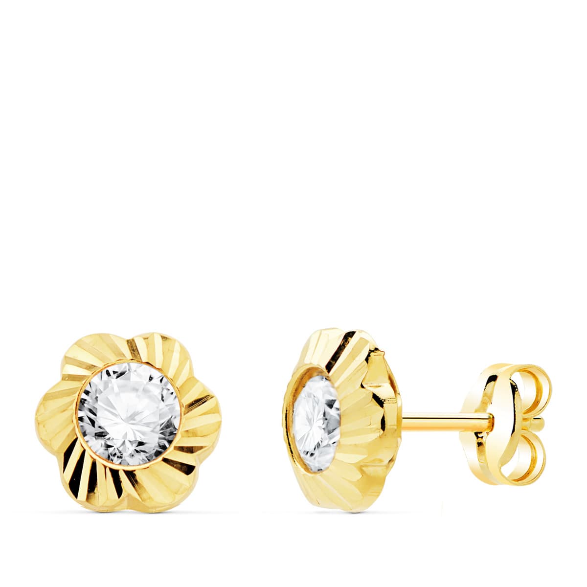 18K PENDIENTES ORO AMARILLO FLOR TALLADA CON CIRCONITA 7X7 MM CIERRE PRESION