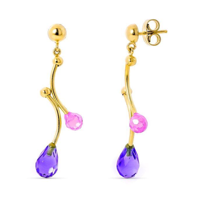 18K PENDIENTES ORO AMARILLO LARGO PIEDRAS AMATISTA Y ROSA