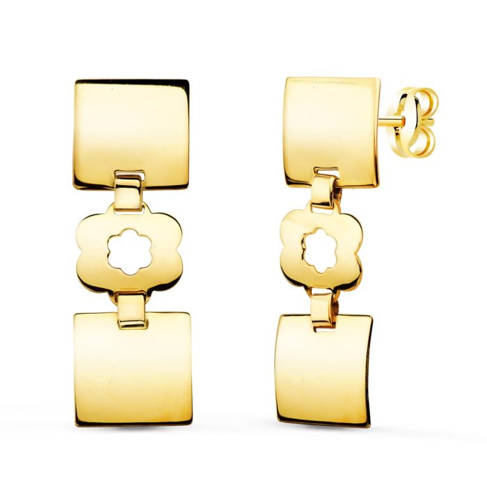 18K PENDIENTES ORO AMARILLO TRES CUERPOS CUADRADOS Y FLOR 32X10 MM PRESION