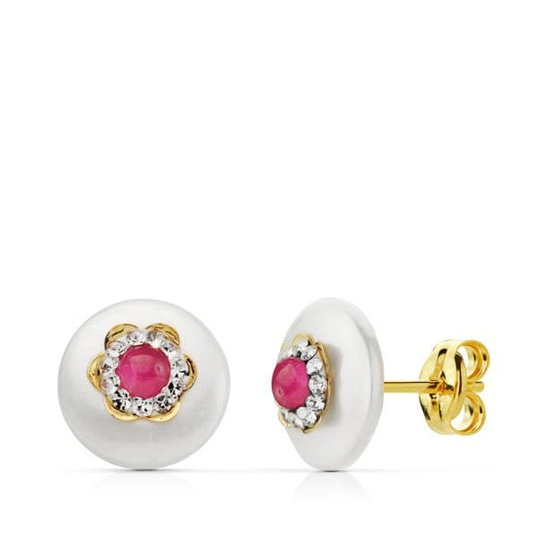 18K PENDIENTES ORO AMARILLO NACAR 9 MM PIEDRA ROJA 3 MM PRESION