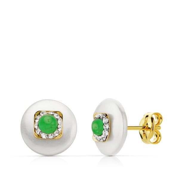 18K PENDIENTES ORO AMARILLO NACAR 9 MM PIEDRA VERDE 3 MM PRESION
