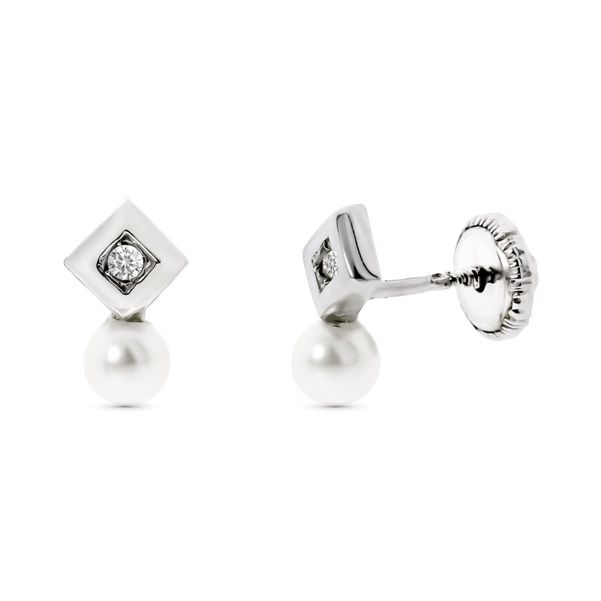 18K PENDIENTES ORO BLANCO CON DIAMANTES Y PERLA CIERRE ROSCA