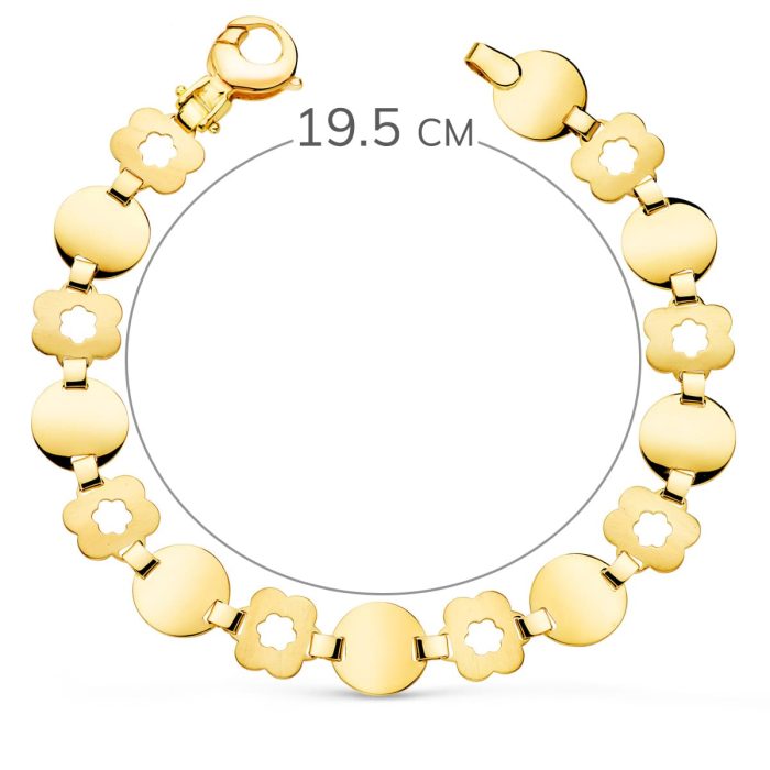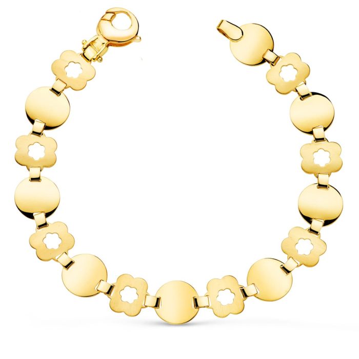 18K PULSERA ORO AMARILLO ESLABON REDONDO Y FLOR MATE ANCHO 10 MM LARGO 19.5CM