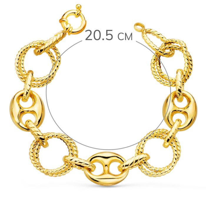 Embárcate en la exquisitez con una pulsera de Oro de Ley de 18 Kilates, una sinfonía de elegancia y refinamiento. Cada pieza 18K PULSERA ORO AMARILLO ESLABONES Y NUDO BARCO. ANCHO 20 MM LARGO 20.5 CM es una obra de arte, fusionando lujo con atemporalidad. Lleva contigo la distinción del oro puro, una declaración de estilo que resplandece con cada movimiento, un accesorio incomparable para destacar tu elegancia única. Además esta Pulsera está fabricada por el prestigioso fabricante de joyería Pérez Mora de Córdoba, cuna de la joyería de Oro en España.