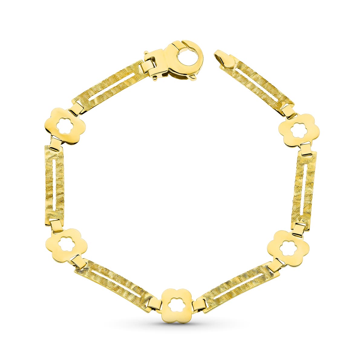 18K PULSERA ORO AMARILLO FLORES Y RECTANGULOS MATE Y BRILLO