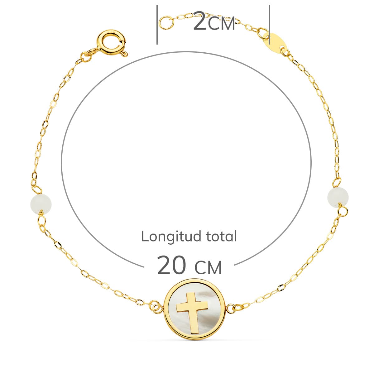 PULSERA ORO AMARILLO NACAR CON CRUZ 12 MM Y BOLAS JADE 4 MM CADENA 18 + 2.5 CM
